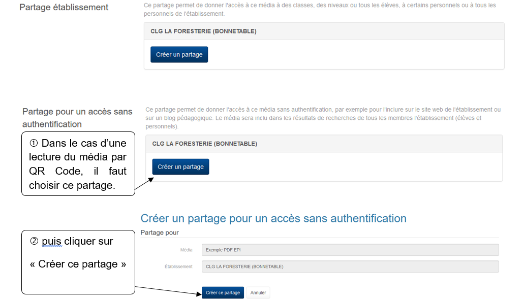 Public et droits d'accès pour les partages académiques : choisissez les personnels et/ou les élèves concernés par ce média. Si vous créez par la suite un partage académique, ce sont ces personnes qui auront accès au média.