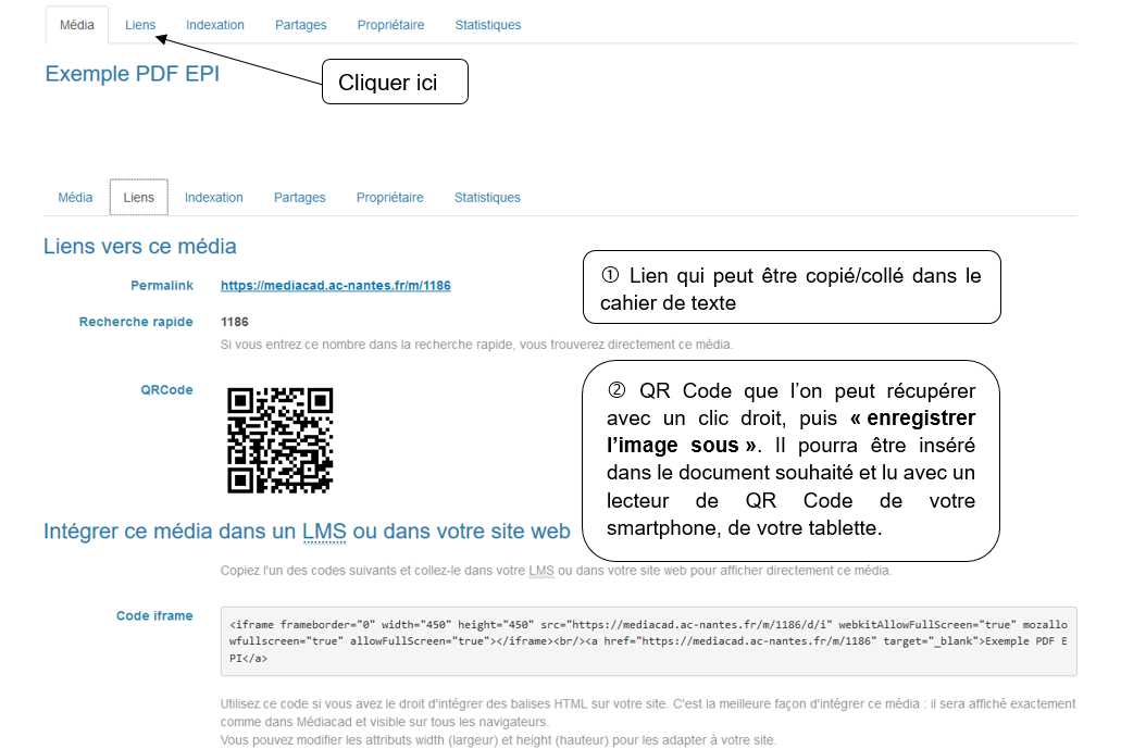 Dans le cadre de notre utilisation du média avec les QR Codes, il faut récupérer le lien du média.