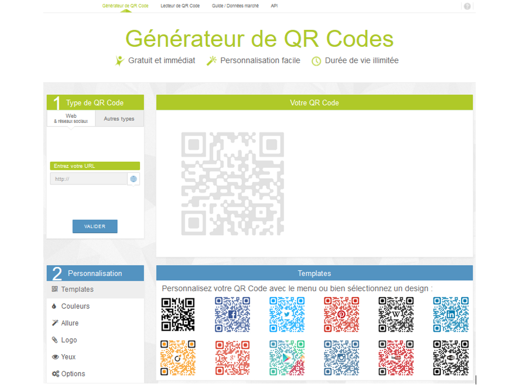 Vous avez en ligne une grande quantité d'applications (le souvent gratuites) qui vous permettent de les créer. Nous utiliserons dans ce tutoriel le site https://www.unitag.io/fr/qrcode.