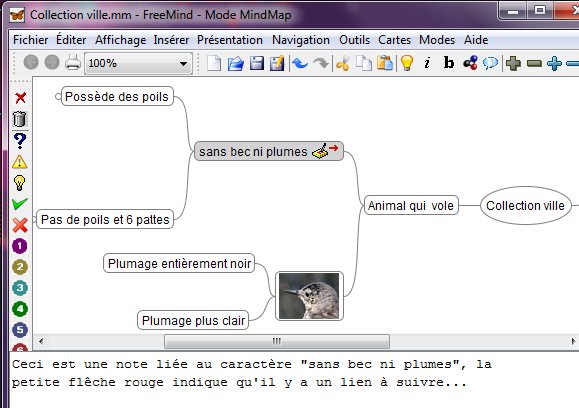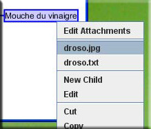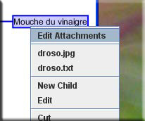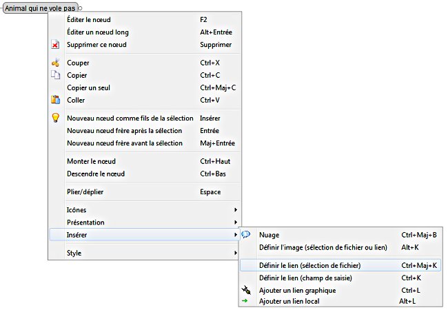 Pour FreeMind : la procédure est simple, en cliquant avec le bouton droit sur le cadre choisi, on peut insérer un lien vers une image ou un texte (il faut choisir l'un ou l'autre car un seul lien est possible). Il peut s'agir d'une simple image, d'un document texte, diaporama, d'un son, d'un film ou un lien internet...
