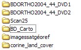 A l'intérieur de ce dossier, des sous-dossiers contiennent les données qui ne sont ouvertes qu'à la consultation. Pour éviter de polluer ces dossiers avec des productions d'élèves mal enregistrées, il est conseillé de paramétrer ces dossiers en lecture seule. C'est le cas ici des dossiers contenant la BDOrtho, le Scan25, le BDCarto et CORINE Land Cover. Cela évite aussi les effacements intempestifs.