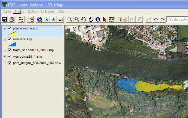 Au cours de certaines activités, les élèves peuvent être amenés à créer de nouvelles couches de données. Il faudra veiller à ce que les fichiers correspondants à ces nouvelles couches soient enregistrés dans le dossier dévolu à ce travail. On voit ici que les élèves ont créé les couches "prairie sèche" et "roselière" dans le projet sur la biodiversité.
