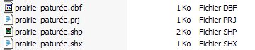 Il est indispensable que le fichier .shp qui contient les coordonnées des entités soit accompagné d'un fichier .shx et d'un fichier .dbf qui contient les données attributaires liées aux entités. Les fichiers .prg et .xml qui accompagnent parfois cet ensemble contiennent soit des métadonnées soit des paramétrages d'affichage.