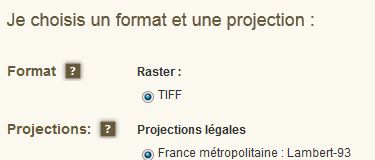 Dans l'écran suivant il faut choisir le format et le système de projection. Pour la métropole, seul le Lambert 93 est disponible gratuitement.