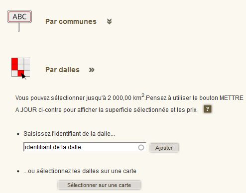 La constitution d'un jeu de données nécessite souvent de télécharger plusieurs produits complémentaires. Il faut veiller à toujours choisir le même système de coordonnées lors de la commande. Par défaut le système offre le système Lambert 93 qui a remplacé tous les autres systèmes de coordonnées en tant que système légal pour la métropole depuis le printemps 2009. Certaines données en Lambert 2 sont toujours disponibles mais ne rentrent pas dans le cadre de la convention de mise à disposition gratuite.