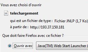 Il faut choisir d'ouvrir avec "Java Web Start Launcher" et accepter le risque dans l'écran suivant.