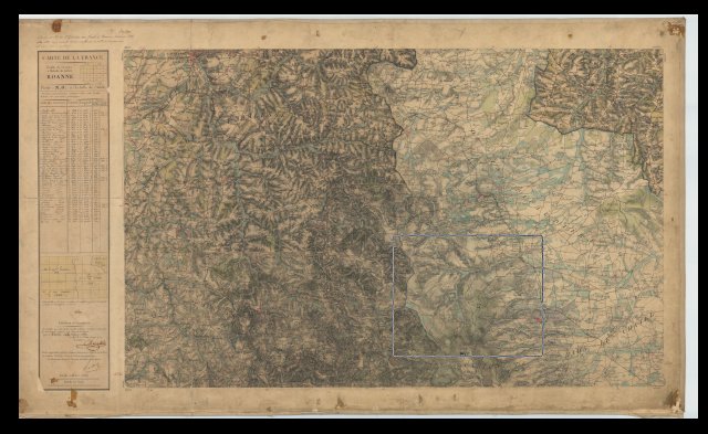 Un clic sur la feuille souhaitée fait apparaître une fenêtre de choix. Nous voyons que la feuille sélectionnée correspond à la feuille de Roanne dressée en 1866.