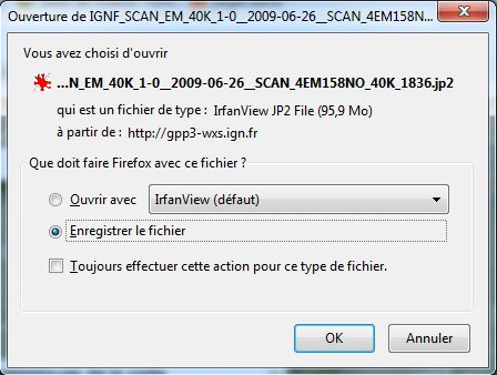 Un clic sur "Télécharger la carte" lance la procédure de téléchargement. Celui-ci peut être très long car le fichier correspondant à une feuille est de très grande taille. Il faut mettre ce fichier dans un dossier spécifique et non sur le bureau.