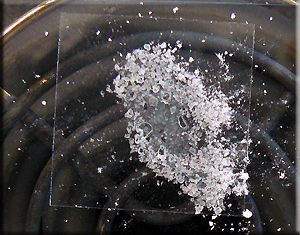 A partir de 60°C, on observe uniquement un début de fusion sur la lame portant du dihydrogénophosphate de sodium hydraté : les cristaux laissent place à quelques gouttes de liquide :