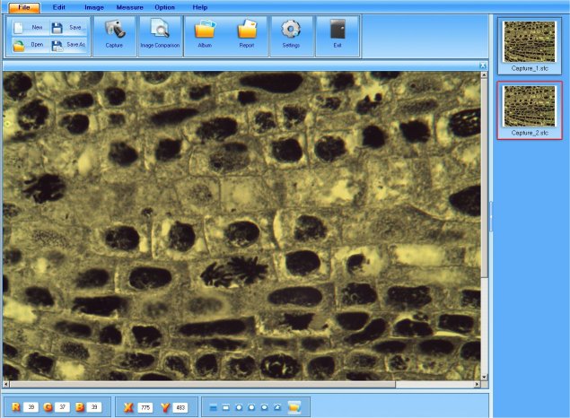 L'image est transférée dans le logiciel d'imagerie sous la forme d'une vignette dans la colonne de droite. Un clic sur cette vignette l'affiche dans la fenêtre de visualisation qui permet bon nombre de traitements allant de l'enregistrement à la prise de mesures de dimensions ou d'angles.