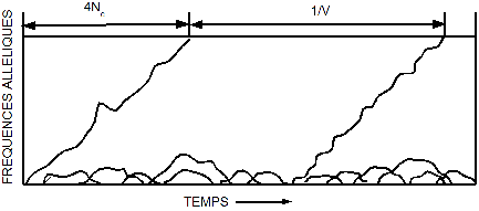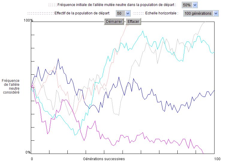 Les constats qualitatifs sont alors remplacés par une simulation graphique de l'évolution des fréquences alléliques en fonction du temps. En utilisant l'outil de simulation graphique "allèle neutre" on pourra faire varier l'effectif de la population et le nombre de générations. Il apparaît que plus la population est petite plus la disparition d'un des allèles est probable et rapide.