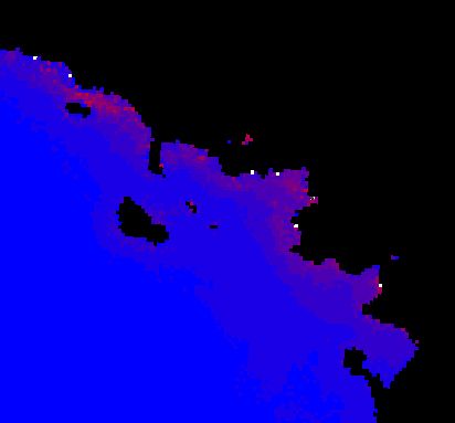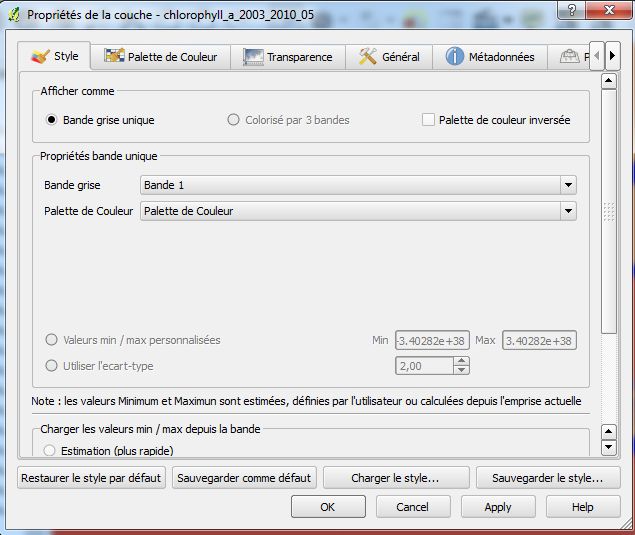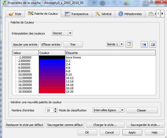 Pour générer une nouvelle palette de couleurs, choisir le nombre d'entrées et cliquer sur "Classer". Une palette allant du bleu au rouge est affichée. Les valeurs de limites seront changées ainsi que les étiquettes. Il faut ensuite "Ajouter une entrée" qui caractérisera les pixels "terrestres" avec les valeurs négatives. Le bouton "Apply" permet de prévisualiser le résultat. La validation l'affiche et un clic sur le petit + en face de la couche traitée affiche sa légende.