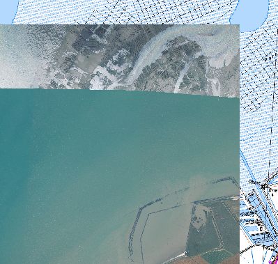 Ici ont été superposés dans le SIG, le Scan25, la BDOrtho2004 de la Loire-Atlantique qui correspond à une période de basse mer et la BDOrtho2006 de la Vendée correspondant à la pleine mer. La zone géographique se situe au nord du Gois le long de la côte continentale.