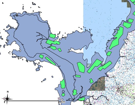 Malgré leurs imperfections (le lac de Grand Lieu et l'île de Noirmoutier cartographiés comme zones intertidales !) ces données permettent de se rendre compte que les cultures marines sont toutes inscrites dans la zone de balancement des marées.
