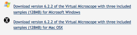 Pour obtenir le logiciel il faut se rendre sur le site le site the virtual microscope et cliquer sur le fichier correspondant à son système d'exploitation. Le logiciel est disponible pour windows, mac, ainsi que pour linux.
