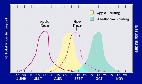 L'aubépine est un arbre qui pousse partout en Amérique du Nord et produit un petit fruit (la cenelle), consommé par une larve de mouche. En 1864, des pomiculteurs de l'État de New York découvrent une larve inconnue se nourrissant de pommes. Avec les années, une population de mouches de l'aubépine s'est différenciée progressivement, privilégiant le fruit de la pomme plutôt que celui de l'aubépine .