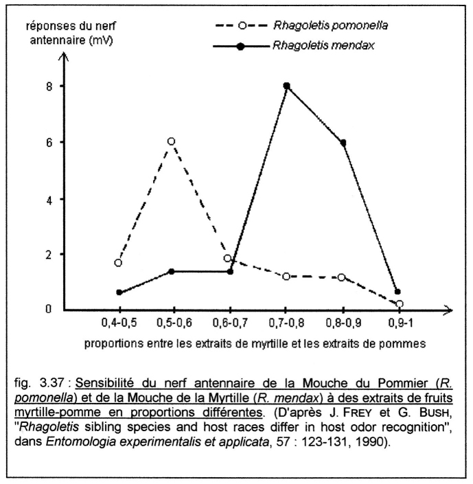 Chez les Insectes parasites de ce type, des études ont montré que si l'orientation des mouches est visuelle, la reconnaissance spécifique de l'hôte peut être olfactive. La sensibilité olfactive antennaire de deux espèces de Mouches, Rhagoletis pomonella du Pommier et Rhagoletis mendax des Myrtilles du genre Vaccinium, a été éprouvée. La capture des adultes et la ponte des mouches du pommier sont plus fréquentes sur des arbres ou sur des fruits artificiels parfumés à la pomme, que sur des arbres ou sur des fruits dépourvus d'odeur ou parfumés à la myrtille. Les expériences avec R. mendax donnent des résultats symétriques.