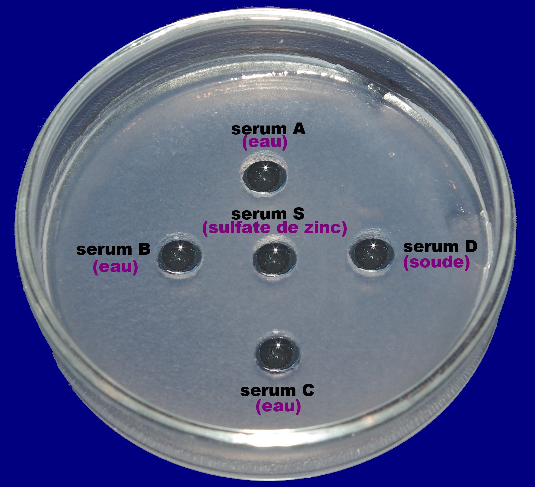 La spécificité d'un anticorps est liée à sa capacité de liaison avec une molécule donnée l'antigène. Le test d'immunodiffusion, ou test d'Ouchterlony, permet la mise en évidence de cette liaison antigène-anticorps. Les produits utilisés ici sont remplacés par des produits de substitution « mimant » la réaction.