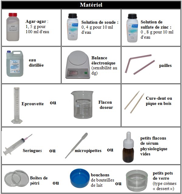 Peser 1, 5 g d'agar-agar et le verser dans 100 ml d'eau distillée froide.(on réalise environ 15 boîtes). Faire chauffer doucement en remuant bien tout le temps jusqu'à apparition de bulles mais ne pas faire bouillir (le mélange devient limpide). Couler ensuite l'agar-agar chaud sur une hauteur de 3 mm environ dans les bouchons, petits pots ou les boîtes de Pétri.(toute la gélose est utilisée). Laisser refroidir jusqu'à la prise de l'agar-agar.(Les puits s'évident mieux si on passe les boîtes,quelques minutes, au réfrigérateur avant leur utilisation ).