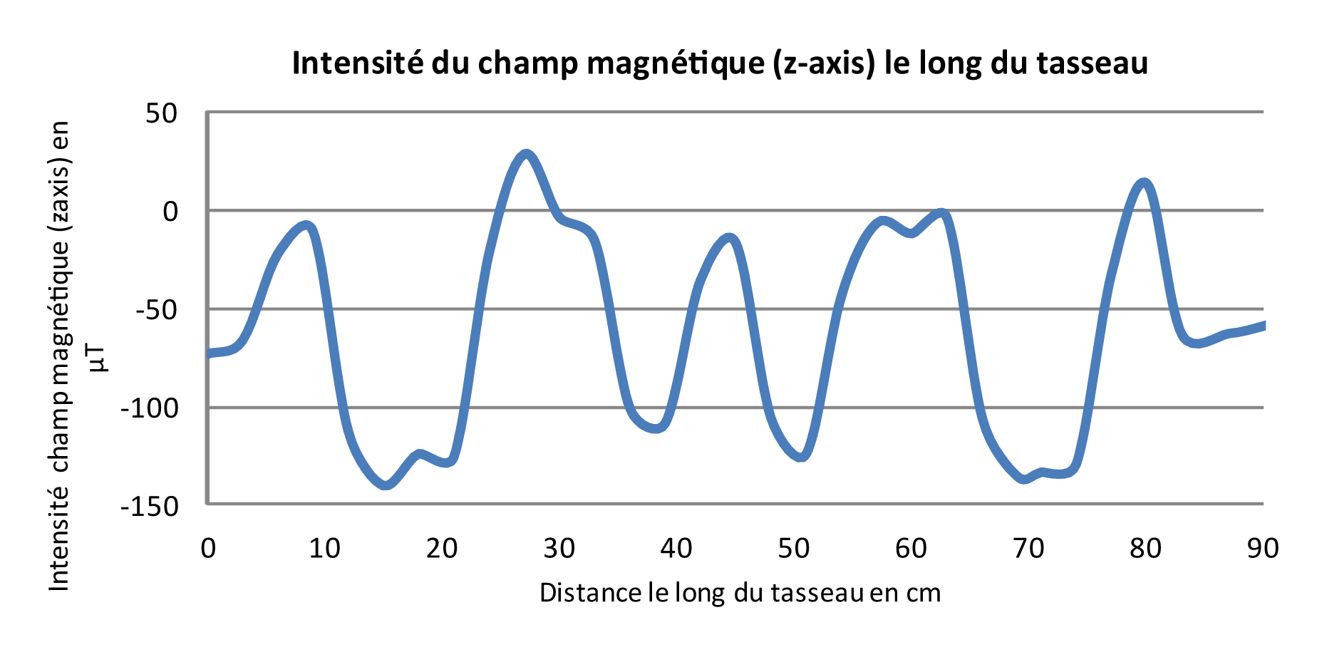 - Une fois l’autre extrémité du tasseau atteinte, reporter les mesures dans un tableur de résultats et construire le graphique montrant l’évolution de l’intensité du champ magnétique (z-axis) le long du tasseau.