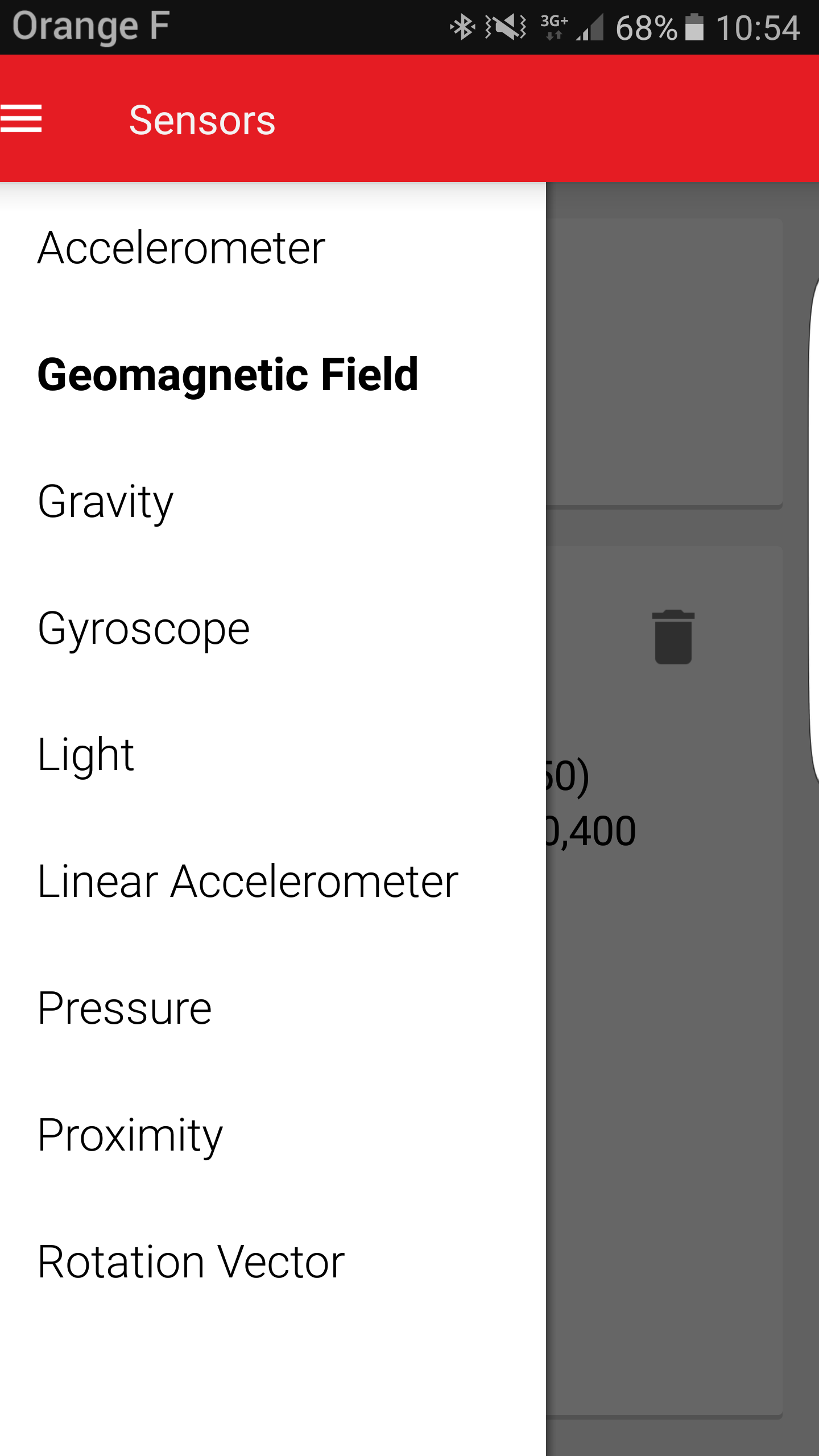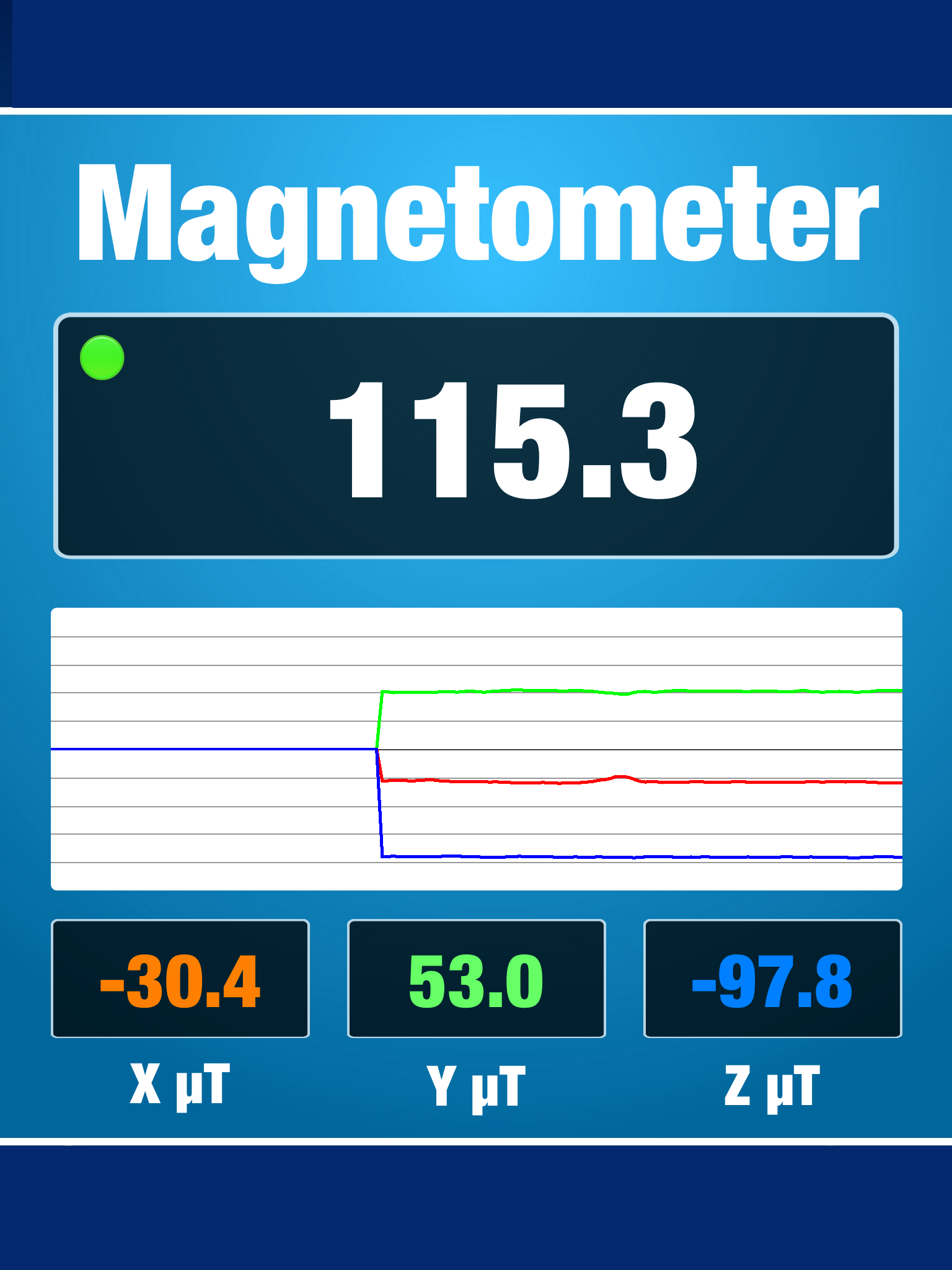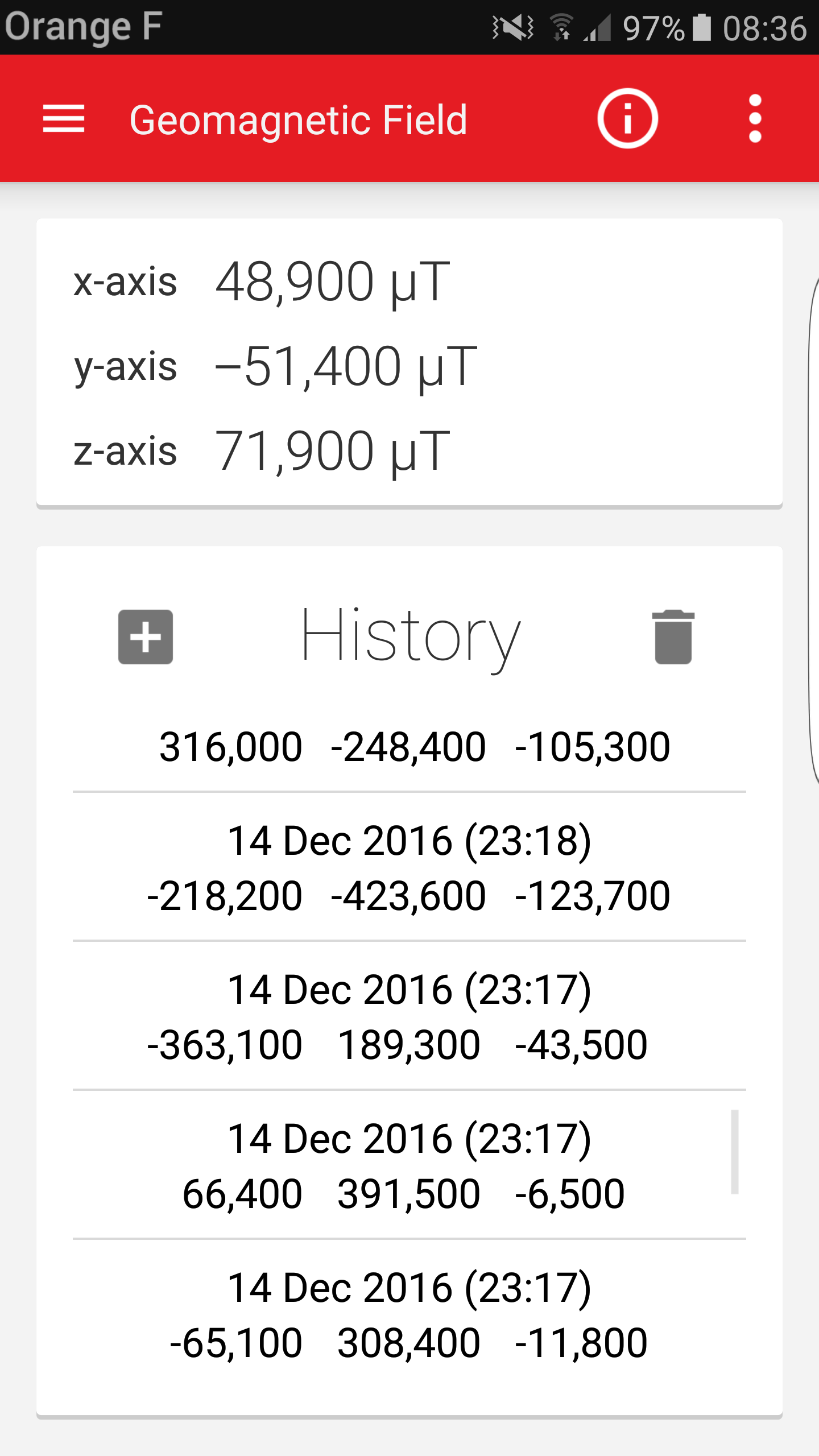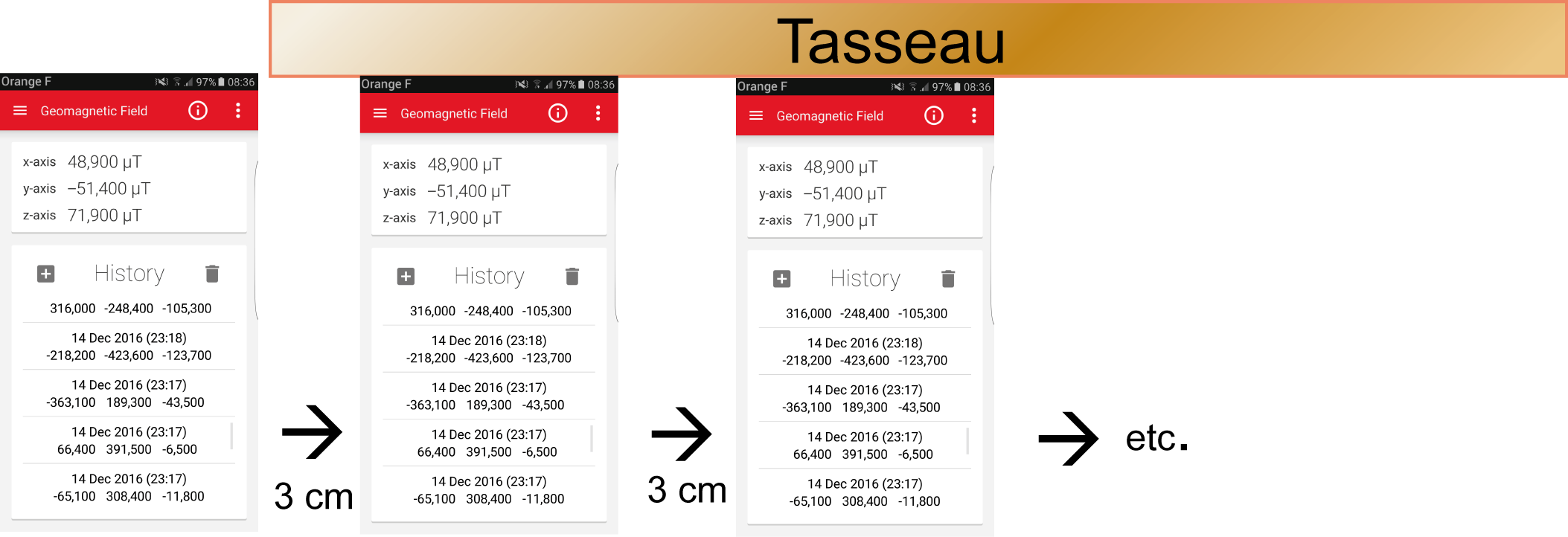 - Avec "Magnetometer", attendre que le capteur se stabilise (quelques secondes) et compléter directement le tableau de résultats suivant. Avec cette application, il n'y a pas la possibilité d'enregistrer les données.