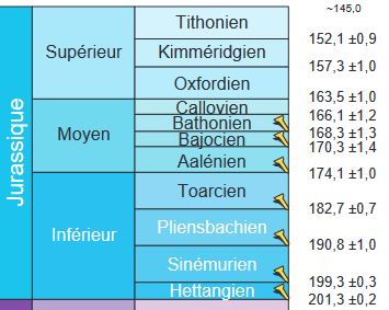 Étant très réduit et potentiellement ensablée par endroits, il n'est pas facile d'observer des fossiles stratigraphiques, surtout dans le Toarcien. Cependant, en recoupant plusieurs types d'informations (diversité de la faune, type de calcaire (couleur, composition chimique), on peut identifier les principaux étages.