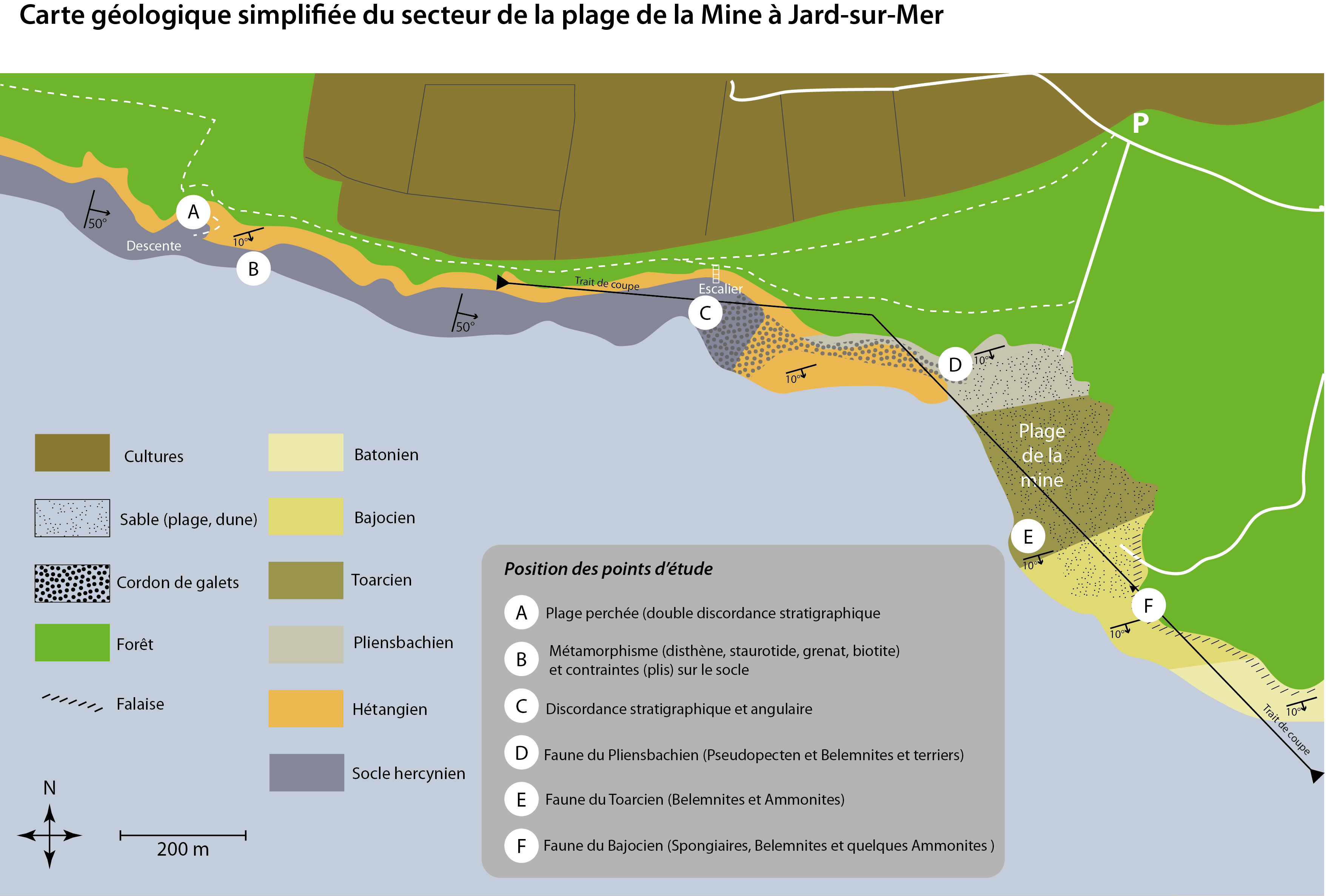 Le lieu de la sortie est la plage de la Mine à Jard-sur-Mer. A marée basse, sur l'estran mais aussi sur les falaises qui bordent la plage, l'on retrouve la base du Jurassique en discordance sur le socle hercynien. La base du Jurassique est très réduite mais regroupe les premiers étages : Hettangien-Sinémurien / Pliensbachien / Toarcien / Aalénien / Bajocien.