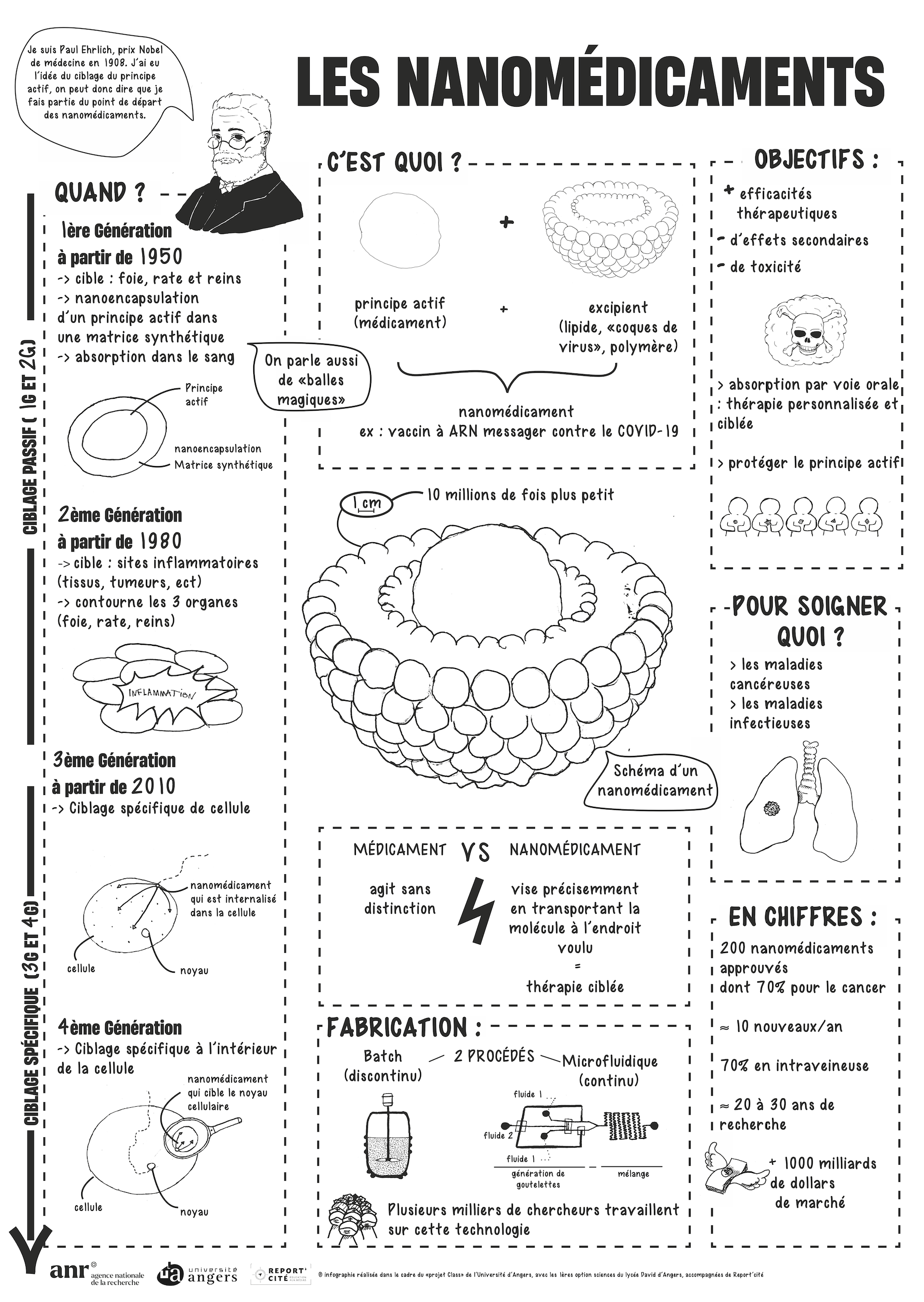 A travers le projet [CLASS, Chercheurs et Lycéens, Acteurs des Sciences pour la Société], une classe de première Spécialité SVT du lycée David d'Angers, accompagnée par un enseignant-chercheur et par une association d'éducation aux médias, a élaboré une infographie sur les nanomédicaments.