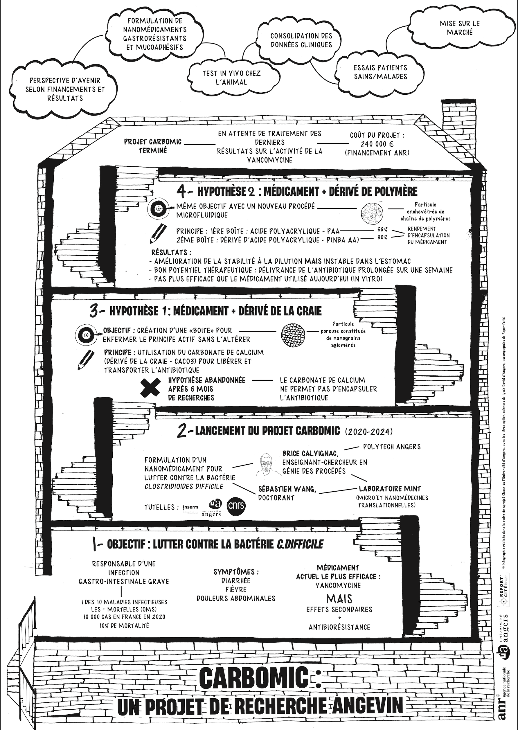 A David d’Angers, il s’agissait d’un travail avec un groupe de première spécialité SVT (29 élèves). Le chercheur, Brice CALVIGNAC est intervenu pour deux conférences d’1h (une généraliste sur le concept de nanomédicaments, vecteurs de principes actifs et l’autre sur le travail réalisé par un thésard du laboratoire MINT lors du projet Carbomic, ses échecs et succès).