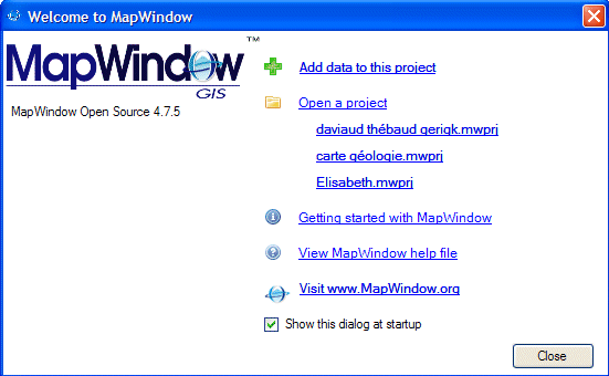 Lors de la création d'un nouveau projet, le travail peut donc commencer directement. Il suffit d'enregistrer le projet sous un nouveau nom. Le fichier créé porte l'extension .mwprj qui est spécifique de mapwindow.