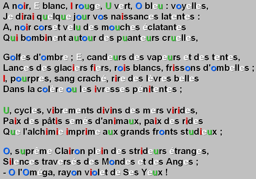 Initialement, je souhaitais baser cette séquence sur ce poème. Il permet, dés le premier vers, de déterminer les perceptions chromatiques des 5 voyelles de l'alphabet et on y trouve des références aux couleurs (glaciers, sang...), à des sons (vol des mouches, rire, silences...) et à des odeurs (la puanteur).