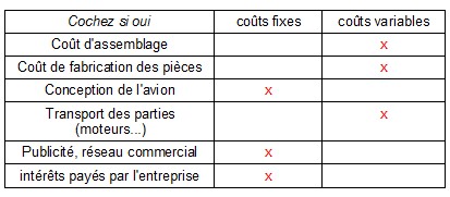 En sachant que les coûts fixes ne varient pas en fonction des quantités produites, contrairement aux coûts variables, identifiez les coûts suivants :