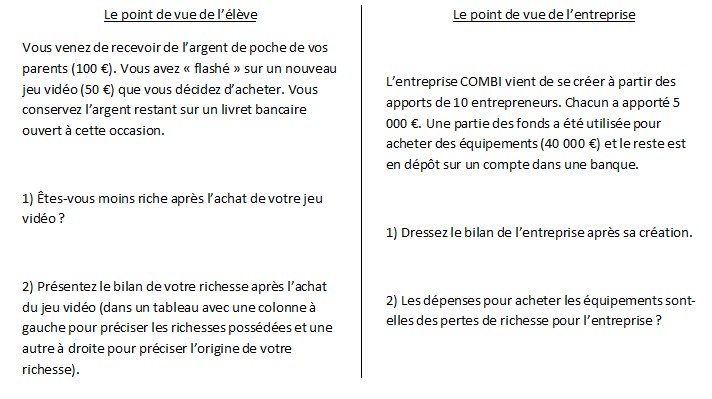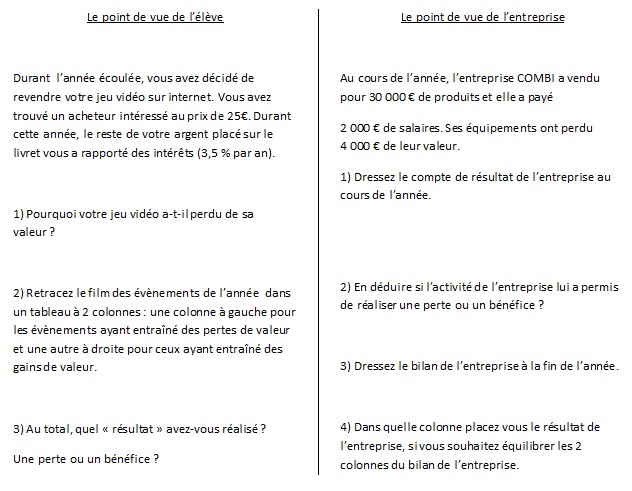 Exercice : on commence par le point de vue de l'élève pour découvrir le bilan, puis on passe au point de vue de l'entreprise.