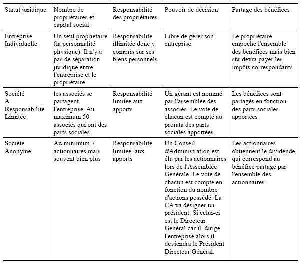 A travers l'exercice ci-dessous tu vas rencontrer les formes juridiques les plus fréquentes. En te référant au tableau et en faisant quelques recherches tu répondras aux questions.Sa société de services ne nécessite donc pas de gros moyens. Toutefois, elle emprunte 30000 € principalement pour l'achat d'un véhicule utilitaire d'occasion.