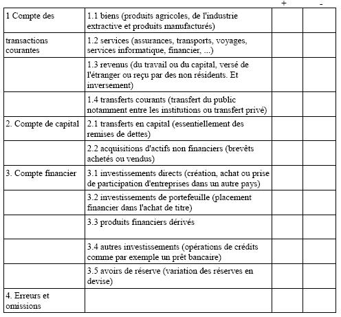 1) Exportation (+) ou importation (-)? Entrée (+) ou sortie (-) de capitaux? (le pays de référence est la France). Quand une opération se traduit par une entrée de devises, elle est inscrite avec signe + dans le compte correspondant, si elle se traduit par une sortie de devises, c'est le signe -.