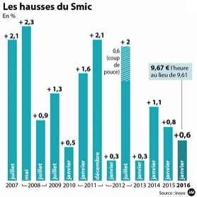« Quant à François Fillon, le grand gagnant de la primaire de la droite française, il a d'ores et déjà annoncé qu'il voulait «revoir» le mécanisme de revalorisation afin qu'il prenne en compte la «pression concurrentielle internationale.» Dans son programme tourné vers la compétitivité des entreprises, l'ancien locataire de Matignon fustige l‘augmentation mécanique du Smic qui a, selon lui, pour effet de renchérir le coût du travail en France. »