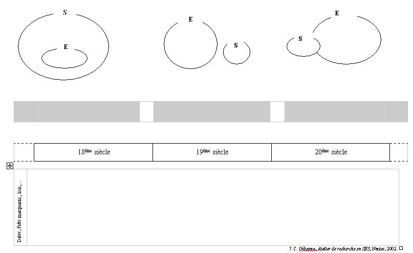 Dans la frise ci-dessous, la lettre E désigne la sphère économique et la lettre S la sphère sociale.