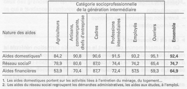 Nature des aides (%) apportées par la génération intermédiaire (âgée de 49 à 53 ans) aux jeunes (âgés de 19 à 36 ans) selon la catégorie socioprofessionnelle