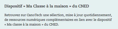 Chaque jour, nos référents pédagogiques recensent les ressources de Réseau Canopé et de ses partenaires utiles à la continuité éducative à distance. CanoTech complète ainsi les dispositifs sur lesquels vous pouvez déjà vous appuyer tels que la plateforme du Centre National d'Enseignement à Distance (CNED) : « Ma classe à la maison ».