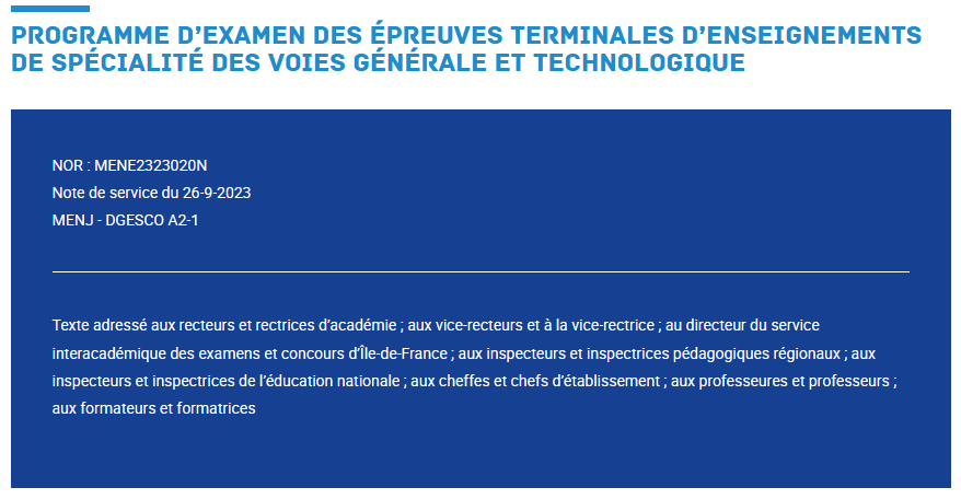 Publié le 4 octobre 2023 - Mis à jour le 4 octobre 2023 Examens - concours Évaluation programme d'examen des épreuves terminales des enseignements de spécialité de la voie générale Elle est applicable à compter de la session 2024 du baccalauréat. Le 4 octobre 2023