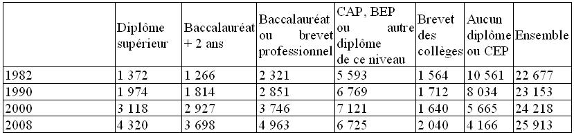 Nombre d'emplois selon le plus haut diplôme obtenu (moyenne annuelle en milliers)