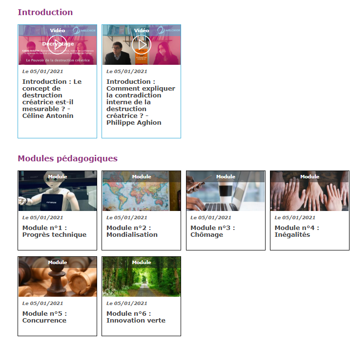 Les modules sont constitués de fiches réalisées par Philippe Deubel, IA-IPR de SES à partir d'extraits du livre Le pouvoir de la destruction créatrice reproduits avec l’aimable autorisation des Editions Odile Jacob, de vidéos et de la note de lecture du livre. Ils pourront enrichir nos cours et inspirer les élèves pour préparer leur grand oral du Bac.
