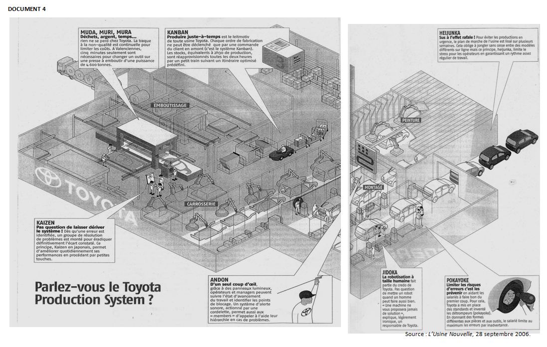- Réflexion sur les documents 3 et 4 : retrouver les principes du toyotisme, les ruptures avec le taylorisme.