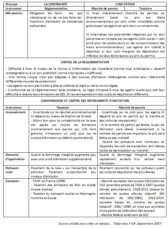 L'efficacité des politiques environnementales dépend du choix des instruments et de la façon de les utiliser. Une comparaison des instruments et de leurs limites est proposée en annexe n°2. La contrainte consiste à réglementer (imposer des normes et sanctionner les contrevenants) et l'incitation à faire en sorte que les coûts privés supportés par les producteurs d'externalités négatives incluent les coûts sociaux (donc à "internaliser les externalités"). Les instruments de l'incitation sont la taxation (fiscalité environnementale) ou la création d'un marché de permis d'émission, comme l'a fait l'Union Européenne en 2005 pour les gaz à effet de serre. Jean-Paul Fitoussi s'est prononcé en faveur de la taxation. Antoine Frérot a rappelé que "taxer le vice" (les pollueurs) revenait à donner un "avantage financier à la vertu" car les entreprises s'engageant dans la dépollution feront l'économie de la taxe environnementale. Si, en dehors de la taxation environnementale, on peut subventionner directement les bons comportements, il faudrait également arrêter de subventionner les externalités négatives comme on le fait aujourd'hui.