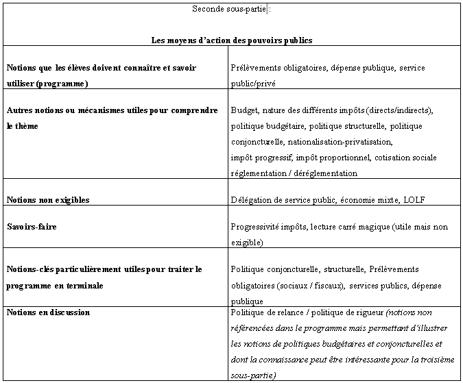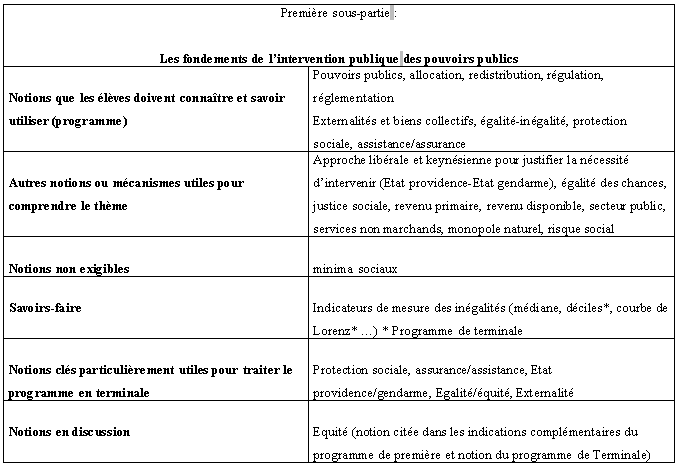 Selon les indications complémentaires du programme de première, il s'agit de proposer une " première analyse" des interventions des pouvoirs publics, ces questions devant être "développées par la suite dans le programme de la classe terminale". Cette partie du programme de première revêt donc deux enjeux essentiels :