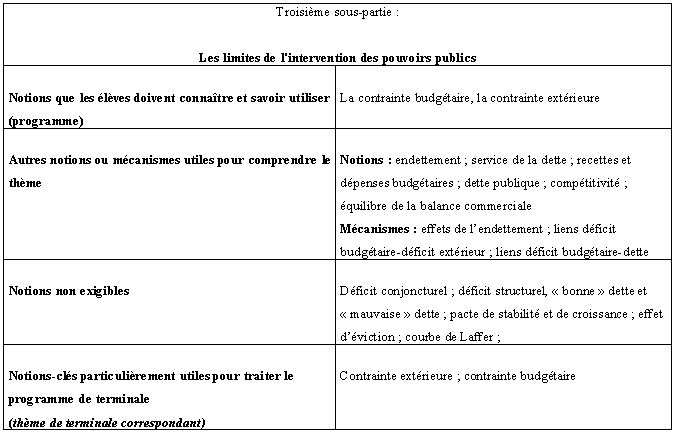 L'objectif est de faire simple sur des notions complexes, d'être exhaustif sans être encyclopédique. Il n'est donc pas souhaitable d'étendre le programme au-delà de ce qui est nécessaire. Il faut notamment tenir compte des durées indicatives proposées par le programme sur ce thème : six semaines, soit 24 heures de cours et 6 heures de travaux dirigés. Ce temps doit être suffisant pour faciliter la compréhension des éléments fondamentaux sur les interventions des pouvoirs publics et s'assurer que ces bases sont réellement maîtrisées en fin de séquence.