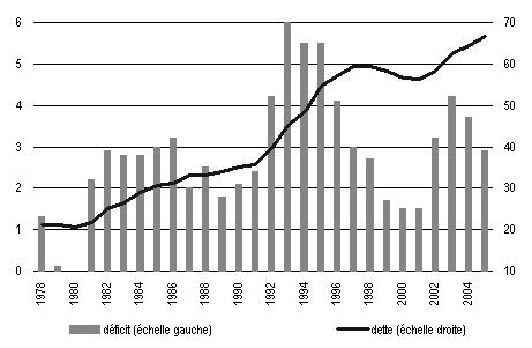 Les dépenses publiques ont excédé les recettes de l'Etat pendant 34 des 48 dernières années. Si les dépenses financées par ces déficits servent à doper la croissance, cela ne pose pas de problème : les recettes qui découlent de cette croissance permettent de rembourser les emprunts antérieurs. Les entreprises fonctionnent d'ailleurs de la même façon: elles ont aussi été en "déficit" pendant 43 des 48 dernières années, ayant recours à l'épargne des ménages pour se financer. Mais avec le ralentissement de la croissance, ce cercle vertueux ne s'est pas mis en place et la dette publique a explosé, au point d'atteindre 64% du produit intérieur brut (PIB) en 2006.Source : Alternatives économiques, septembre 2007.