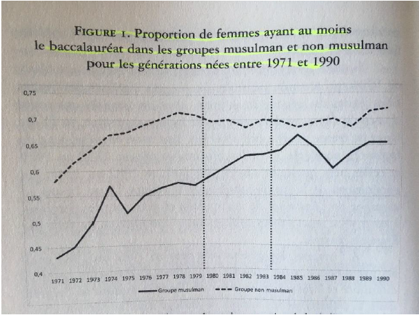Il compare ces données avec celles de la génération née au début des années 90. Dans cette génération post-interdiction du voile, le déficit de bachelières du groupe « musulmans » n’est plus que de six points (68% contre 74%), soit moitié moindre. Pour les garçons, en revanche, il est resté identique : douze points. Il y a donc bien un effet propre aux jeunes filles « musulmanes », et non aux « musulmans » dans leur ensemble (qui aurait pu, par exemple, s’expliquer par une moindre islamophobie dans la société française). Manifestement, les difficultés scolaires des jeunes filles « musulmanes » (du moins issues de familles musulmanes) par rapport à leurs homologues « non musulmanes » se sont donc réduites après l’interdiction du voile, contrairement aux garçons « musulmans » (du moins issus d’une famille musulmane) par rapport aux garçons « non musulmans ».