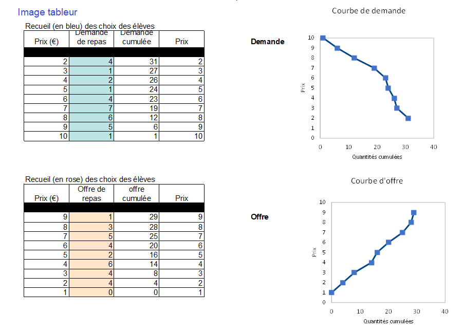 2. L'enseignant reporte dans la colonne bleue « demandes de repas» le nombre de clients nouveaux déclenchés à chaque annonce de prix.