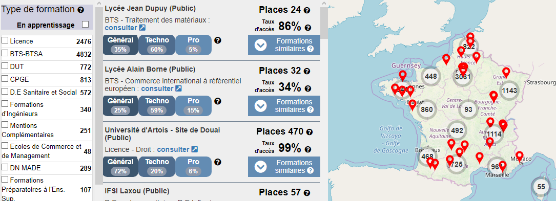 Ce nouvel outil, réalisé par le MESRI en collaboration avec le laboratoire bordelais de recherche en informatique (Labri), avec les données de l'ONISEP, permet aux candidats à l'entrée dans l'enseignement supérieur de découvrir l'ensemble des formations proposées sur la plateforme Parcoursup. Il propose également des modalités de recherche de formations à partir de divers critères (mots clés, types et filières de formations, zones géographiques).